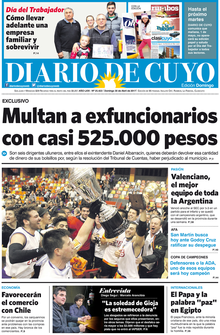 Diario de Cuyo | HOME | Edición impresa Tapa 30 de Abril de 2017 Por Redacción Diario de Cuyo 30/04/2017 · 0:00 Ver los comentarios ›