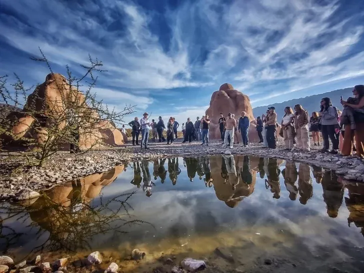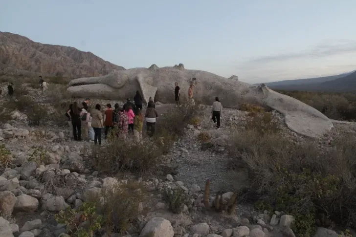 “Arte y Naturaleza’ fue el eje temático elegido para la primera edición de Conexión ArteBA, flamante programa de Fundación ArteBA que el miércoles y jueves pasados se desplegó en San Juan, con la presencia de figuras provinciales, nacionales e internacionales (ver página 14). En ese marco, y como parte de la agenda de actividades complementarias al Foro, se organizó una visita cerrada a Arte Bestial, sin dudas la más consustanciada con la propuesta en la provincia, justamente por sus características. Fue la presentación de un proyecto monumental, único en su tipo, encarado por Ezequiel Eskenazi -con curaduría de Fernando Farina- en el predio de su bodega Xumek, al pie de los cerros del valle de Zonda, que lo enmarcan de manera natural y mágica. No es una galería, ni un museo, ni un parque de esculturas, se encargará de dejar bien en claro su mentor, sino -como prefiere llamarlo- un espacio de montaña que alberga obras de arte de gran porte, realizadas por reconocidos artistas argentinos convocados a tal fin, algunas terminadas y otras todavía en proceso. La primera fue la espectacular ballena, realizada por Villar Rojas hace una década, que hasta ahora cierra merecidamente el recorrido. Para llegar a ella hay que ascender un poco entre jarillas, algunas espinas y rocas; y atravesar un pequeño puente de madera. Lo vale. Nadie es indiferente cuando se topa con ella, con su boca entreabierta, yacente sobre las piedras. ¿Sería más lógico mirarla desde abajo hacia arriba, proyectándola sobre el azul del cielo, que podría oficiar de mar? Tal vez, pero es ahí donde marca el tremendo contraste esta ballena que incluso hizo creer a varios que la sobrevolaron con drones que se trataba de restos fósiles de hace millones de años. Así llegó a algunos portales de noticias. “¡Fake news!’ rió Eskenazi tras contar la anécdota.