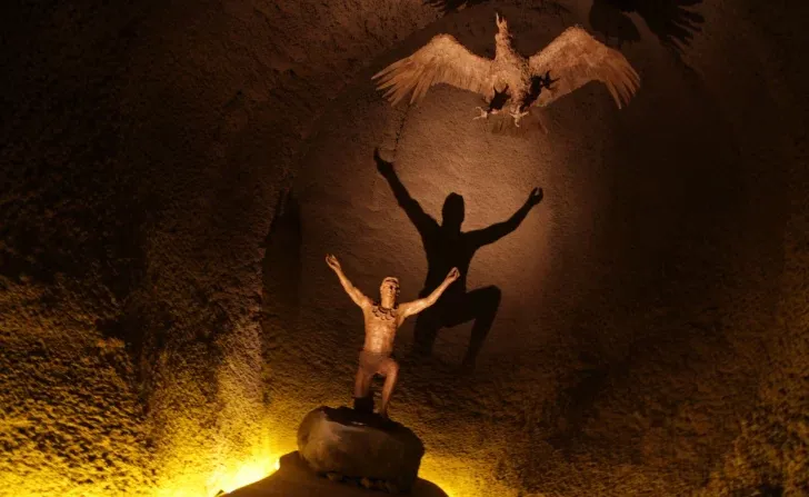 Al pie de Dinobola está la entrada a la cava de la bodega, que dejó boquiabiertos a los visitantes. Una media docena de indios huarpes (faltan dos más) realizados en tamaño natural y distribuidos por el espacio serán como los custodios del vino que allí se guardará. Es una propuesta del escultor y cirujano plástico Ricardo Bustos. “Son huarpes, pero otra visión, no la que se tiene. No sé por qué los representan así, yo tengo información de que fueron altos, esbeltos, bellos’, dijo sobre estas criaturas que se imponen alertas, guerreras. El chamán que adora al cóndor y El llamado del águila (foto con el autor) son dos de estas piezas realizadas en marmolina y resina.