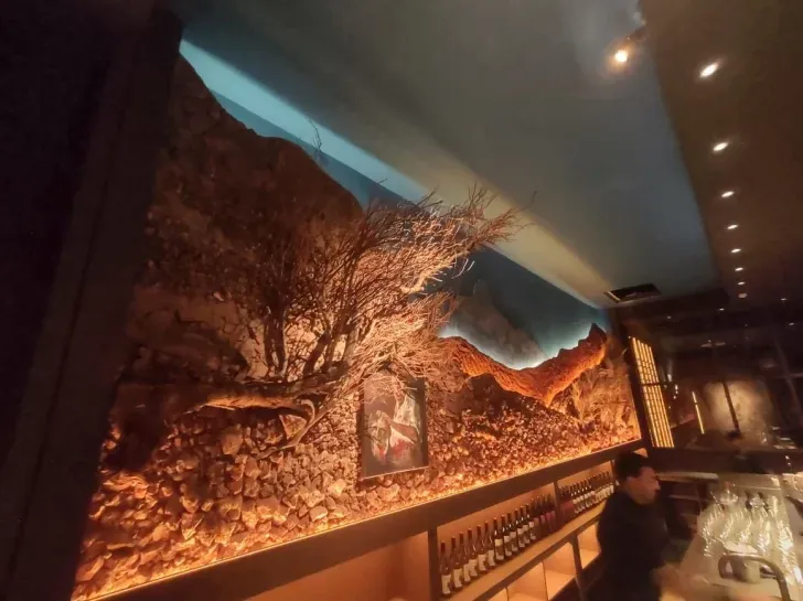 “Arrabales últimos’ se llama el mural que brilla en el área de eventos de la bodega. De 2,60 x 8 m y 2 toneladas de peso, está realizado en piedras, arcilla, barro y vegetación del lugar, acrílicos y óleos. Obra del artista visual y arquitecto Carlos Gómez Centurión, le sumó un cuadro suyo de la serie “La intolerancia argentina’, la cabeza de Narciso de Laprida, que murió degollado por los montoneros de Aldao. El nombre surge de los versos de Poema Conjetural, que Borges dedicó a Laprida (algunos autores dicen que tenían parentesco). “Así, esto que era un paisaje se convierte en un territorio, con historia, pasiones, deslealtades y cabezas cortadas’, expresó el artista.