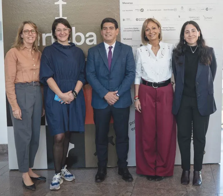 Fotos institucionales. A la izq, Sofia Weil (Consejo de Administración ArteBA), Lucrecia Palacios (directora ejecutiva ArteBA), Guido Romero (Ministro de Turismo, Cultura y Deporte), Marcela Zegaib (Subsecretaria de Cultura) y Pía Monti (Fondos ArteBA).