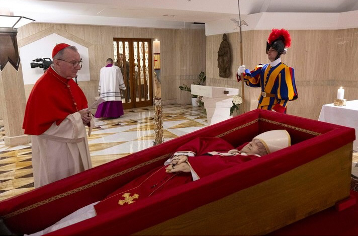 El Vaticano difundió fotografías de Francisco ataviado con sus vestiduras y sosteniendo un rosario, tendido en un ataúd abierto colocado en la capilla de la residencia Santa Marta. Guardias suizos se situaron a ambos lados del ataúd mientras dignatarios, entre ellos el presidente italiano Sergio Mattarella, rendían homenaje al primer papa latinoamericano.