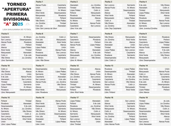 Con cambios, ausencias y las mismas aspiraciones de siempre, desde mañana será el momento de ver lo nuestro para buscar el futuro. Es que con tres partidos arrancará el Torneo Apertura de Primera División de la Liga Sanjuanina de Fútbol que buscará la clasificación de sus representantes al Regional Amateur, además de perfilar a uno de los finalistas para la corona del campeonato Oficial a fin de año. Será con ausencias este torneo porque Atlético San Martín decidió bajarse, priorizando sus obligaciones para afrontar los torneos de AFA en Reserva. Sportivo Arbol Verde y Sarmiento de Zonda serán los nuevos integrantes de la categoría, ocupando las plazas que el año pasado tenían Sportivo Del Bono y Juventud Unida. En este primer certamen del año, serán 19 las fechas de la Fase Clasificatoria, quedando ya clasificado para la final el equipo que termine en la primera posición, mientras que desde el segundo al noveno en la tabla, se cruzarán en partidos eliminatorios hasta consagrar al otro finalista.