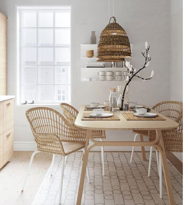 Otro de los espacios de la casa es la cocina. Hay muchas maneras de llevar este material al corazón de nuestra casa y una manera sencilla es mediante una lámpara de techo sobre la zona del office, tanto si es una mesa de comedor aparte como si está adosada a la isla. También puedes incluirlas mediante las sillas o los taburetes de la isla. Otro detalle pequeño es con cestas de mimbre u otras fibras naturales que, además de aportar esa calidez de la que ya hemos hablado, te ayudarán a tener una cocina más ordenada.