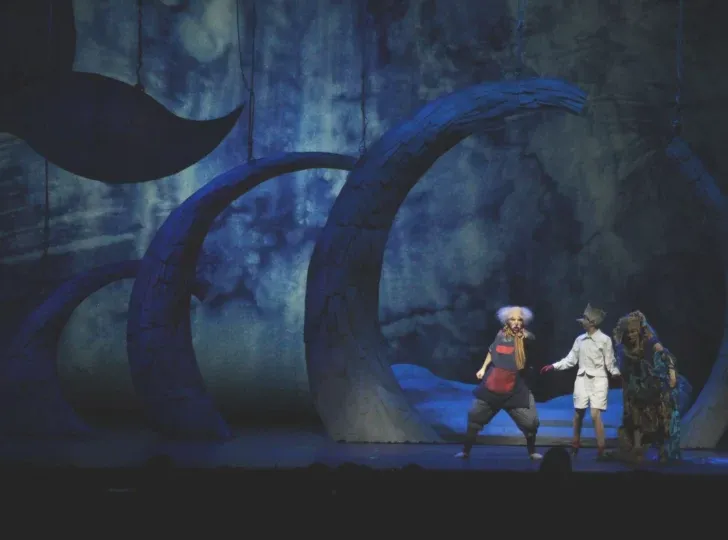 Uno de los puntos a favor de la puesta, es que está cantada en español, que hizo prácticamente innecesario acudir a los subtítulos, con interpretaciones claras, limpias y contundentes. Lejos de los clichés y estereotipos de los clásicos de Disney, esta versión de Bruni, con la dirección artística de Eleonora Comelli, fue mucho más profunda, creíble y necesaria utilizando lenguajes que los espectadores pequeños puedan registrar fácilmente en tiempo presente. Pinocho (Juliana Ribeyrolles/Sabrina Shulthess/Cintia Verna) quiere vivir como los demás niños del pueblo, pero había que afrontar la realidad del mundo: la pobreza en la que vive su padre Gepetto (Juan Pablo Labourdette) y que con su trabajo no alcanza para subsistir; la necesidad de educarse en la escuela; la responsabilidad; ser honesto y por supuesto, ser consciente de las decisiones que emprende, ya que a la larga siempre tienen consecuencias. Así le advirtió el Hada Madrina (Graciela Armendáriz) quien le dio a Pinocho la autonomía y el don de razonar: ‘Ese es el precio que hay que pagar por ser un niño de verdad. Te da hambre y sed. Te da frío. Sientes rabia y si te caes, te duele. Además, tendrás que ir a la escuela. Deberás levantarte temprano en las mañanas para ir a estudiar’. Para ayudarlo, encomienda al Grillo (Claudia Lepe/Gema Bueno/Guadalupe Calvo) a acompañarlo en sus días como la voz de su conciencia. Sin embargo, ante la falta de dinero, Pinocho se va de la escuela y presta ayuda al teatrero del pueblo, el Tragafuegos (Juan Pablo Labourdette). Como recompensa, recibe del marionetista unas monedas de oro. Orgulloso por la hazaña, tiene la intención de ayudar a su padre con el dinero ganado. Pero Zorro (Luis Pulenta), el Gato (Sebastián Alcaraz) y Gato/Zorro (Juan Manuel Caballero) le tienden una trampa para engañarlo y robarle las monedas, aprovechándose de su ingenuidad. ‘Deberías invertir tu dinero en el mercado de valores, así tu capital se incrementará cada día. Lo que necesitás son dos consultores financieros, gente experta como nosotros’, le dicen los inescrupulosos ladrones haciéndose pasar por amigos de su abuelo. Como las cosas resultaron inevitablemente mal, perdido tras el engaño y la traición, Pinocho sale en búsqueda en su abuelo que se perdió en el mar. Allí se produce la escena más icónica del espectáculo, en el interior de la ballena, en lo profundo del mar y en plena soledad, Pinocho y Gepetto intentarán escapar y para evitar una tragedia mayor, Pinocho logra salvar a su abuelo arriesgando su propia existencia. Finalmente, El Hada aparece para darle la última lección cuando estaba a punto de morir: ‘has demostrado que amás a tu papá. Tu corazón comenzó a latir con fuerza cuando tuviste miedo por su vida. En tu pecho late un corazón de niño verdadero… Si escuchas a tu conciencia, te ahorrarás muchos problemas. Cuídate de las falsas amistades y honra siempre la verdad’.