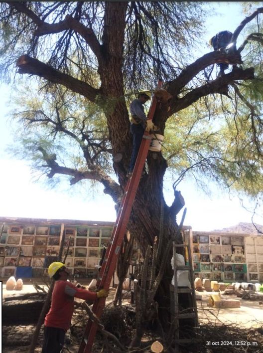> Con asesoramiento de biólogos y agrónomos -Mariángeles Gaviorno, Andrea Abarca, Alejandra Torres y Alfredo Estevez- y coordinación de Arbolado Público y de Ambiente de Jáchal, se hizo poda y tratamiento sanitario en el algarrobo. Su preservación era esencial no solo para el ecosistema local, sino también “desde un punto de vista patrimonial, dado que contribuye a la identidad y a la historia de la región y posee un significado cultural y social para la comunidad local’.