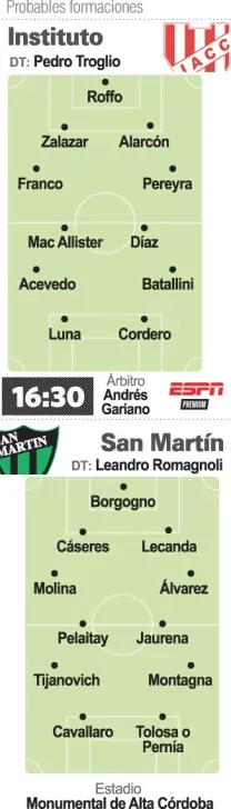 No será un partido más. Entonado por el envión de haber pasado en la Copa Argentina, esta tarde San Martín irá por esa bocanada de aire fresco que necesita para cambiar su presente en la Liga Profesional cuando visite al golpeado Instituto en Córdoba, sabiendo que viven realidades parecidas. El equipo de Pedro Troglio hace siete partidos donde no conoce la victoria: cosechó dos empates y cinco derrotas en una racha negativa que puso al propio entrenador en la cuerda floja y con ese antecedente, San Martín que ya dio vuelta la página con la salida de Antuña y la llegada de Romagnoli. El último triunfo de Instituto fue en la fecha 3, en la victoria 2 a 0 ante Vélez. Luego de eso no ha podido hacer pie y por ahí es donde el Verdinegro puede potenciar sus chances de sumar de a tres. En lo futbolístico, el Pipi mostró ante Gimnasia jujeño su idea táctica con dos líneas de cuatro y dos puntas. Así, en la defensa se decidió por Tomás Lecanda como segundo zaguero central manteniendo a los tres restantes que venían del ciclo anterior: Molina, Cáseres y Alvarez. En el medio, los dos por adentro parecen fijos con Pelaitay y Jaurena, pero ya pidió espacio Diego González. Mientras que por los costados, Tijanovich se quedó con el lugar de Tomás Fernández que ni siquiera viajó, mientras que por la izquierda Ezequiel Montagna puede ser opción por el suspendido Iacobellis. Arriba, Cavallaro es número puesto como uno de los delanteros para moverse por afuera, mientras que de punta la primera elección fue Pernía pero Toloza, Anselmo y hasta Fede González están en la misma línea.