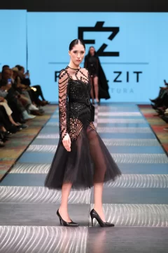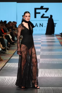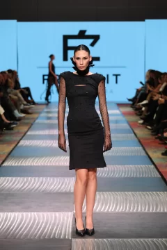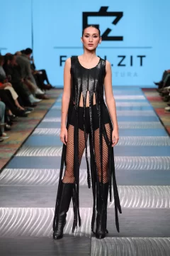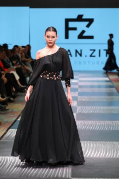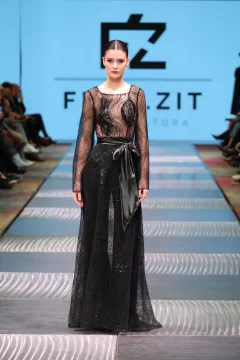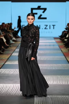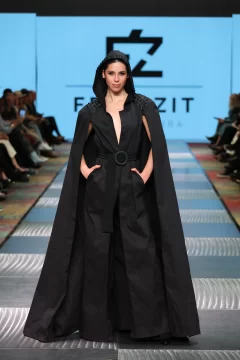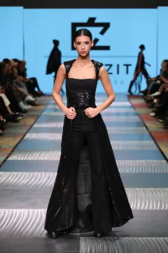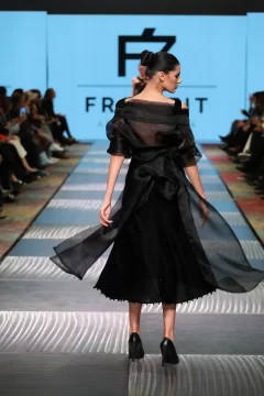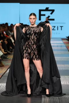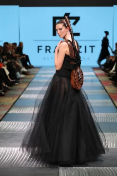 Fran, como lo llaman los más íntimos, cuenta cómo estaba compuesta su cápsula. Lleve al desfile entre 45 a 60 prendas, estaba compuesto por 16 pasadas, en las cuales entran como 3 o 4 prendas, que cada modelo desfilo. La cápsula consistía en vestidos, capas, guantes, pantalones, faldas, etc. Todo lo que se ve en las fotos se elaboro en mi taller. Intervine todos mis textiles. Esto lo comencé armar en el mes de abril con los primeros cortes y las ultimas dos semanas era cuando se concluía todo. Mi concepto de trabajo es sostenible y esta vez escuchar a la mujer desde lo más íntimo. Basándome en mujeres fuertes hermosas y poderosas. Una propuesta estética de luto poderoso: piezas en negro, dramatismo visual y una mirada profunda hacia la fuerza interior de la mujer combinándolo con el arte, el diseño, la actitud y la conciencia ambiental, haciendo del negro un símbolo provocador.