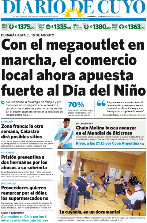 Diario de Cuyo | HOME | Edición impresa Tapa Edición 02 de Agosto de 2025 Por Redacción Diario de Cuyo 02/08/2025 · 4:00 Escuchar la noticia Escuchar la noticia Your browser doesn’t support HTML5 audio Ver los comentarios ›