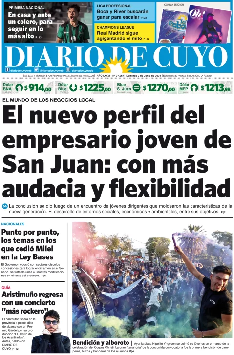 Diario de Cuyo | HOME | Edición impresa Tapa Edición 2 de Junio del 2024 Por Redacción Diario de Cuyo 02/06/2024 · 4:00 Escuchar la noticia Escuchar la noticia Your browser doesn’t support HTML5 audio Ver los comentarios ›