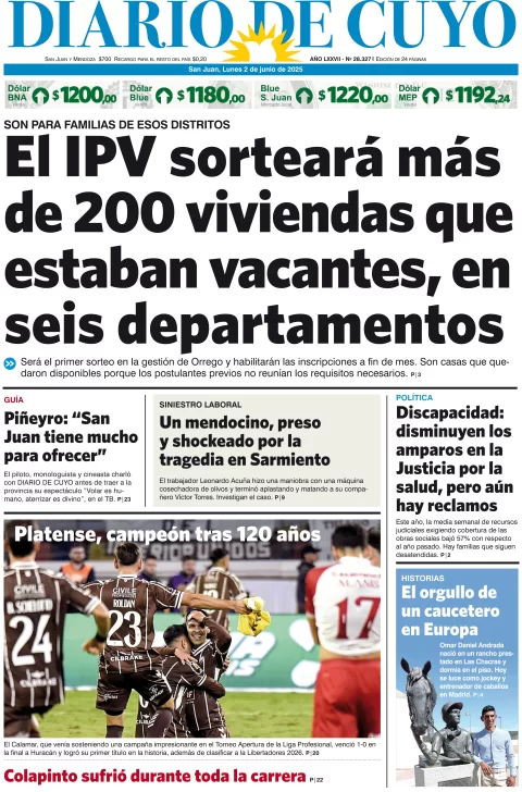 Diario de Cuyo | HOME | Edición impresa Tapa Edición 02 de Junio del 2025 Por Redacción Diario de Cuyo 02/06/2025 · 4:00 Escuchar la noticia Escuchar la noticia Your browser doesn’t support HTML5 audio Ver los comentarios ›