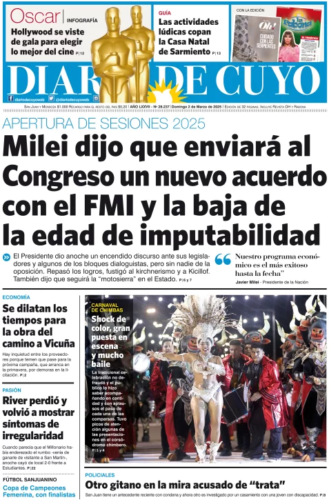 Diario de Cuyo | HOME | Edición impresa Tapa Edición 02 de Marzo de 2025 Por Redacción Diario de Cuyo 02/03/2025 · 3:00 Escuchar la noticia Escuchar la noticia Your browser doesn’t support HTML5 audio Ver los comentarios ›