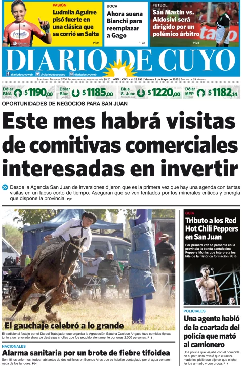 Diario de Cuyo | HOME | Edición impresa Tapa Edición 02 de Mayo de 2025 Por Redacción Diario de Cuyo 02/05/2025 · 4:00 Escuchar la noticia Escuchar la noticia Your browser doesn’t support HTML5 audio Ver los comentarios ›