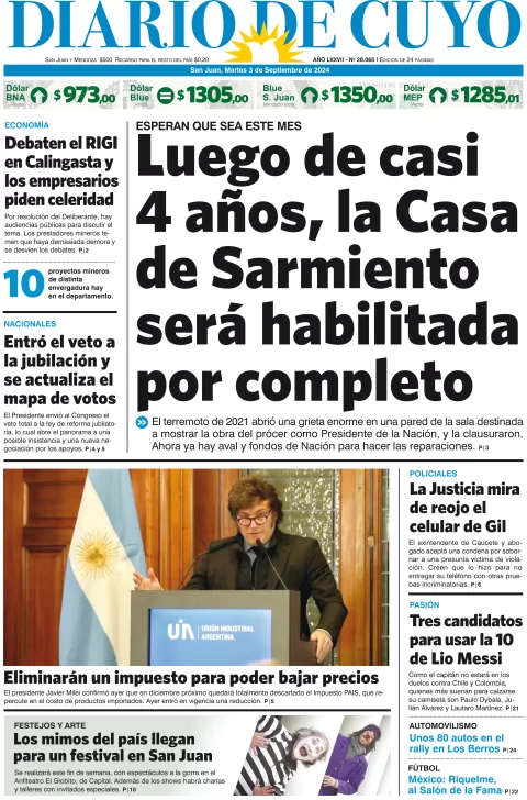 Diario de Cuyo | HOME | Edición impresa Tapa Edición 03 de Septiembre del 2024 Por Redacción Diario de Cuyo 03/09/2024 · 4:00 Escuchar la noticia Escuchar la noticia Your browser doesn’t support HTML5 audio Ver los comentarios ›