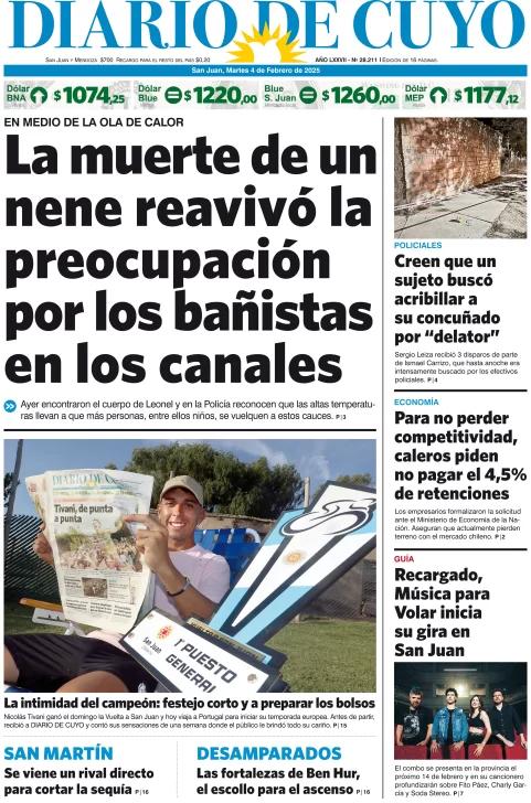Diario de Cuyo | HOME | Edición impresa Tapa Edición 04 de Febrero del 2025 Por Redacción Diario de Cuyo 04/02/2025 · 4:00 Escuchar la noticia Escuchar la noticia Your browser doesn’t support HTML5 audio Ver los comentarios ›