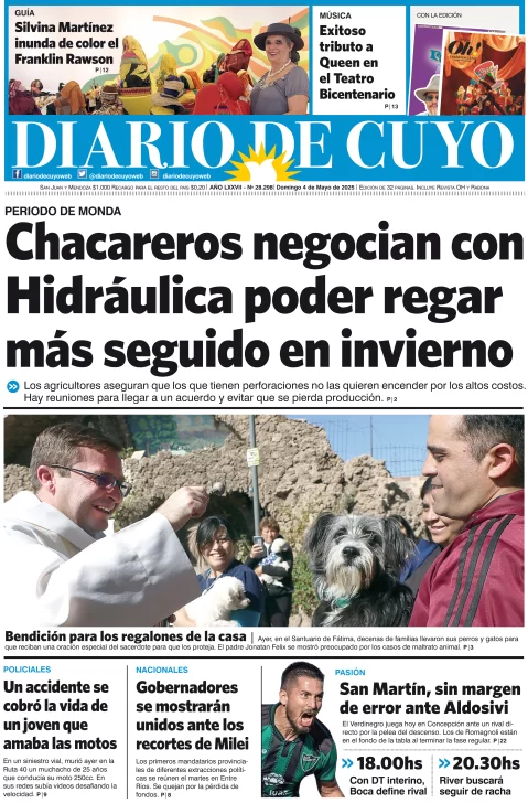 Diario de Cuyo | HOME | Edición impresa Tapa Edición 04 de Mayo de 2025 Por Redacción Diario de Cuyo 04/05/2025 · 4:00 Escuchar la noticia Escuchar la noticia Your browser doesn’t support HTML5 audio Ver los comentarios ›