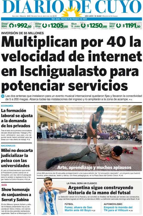 Diario de Cuyo | HOME | Edición impresa Tapa Edición 04 de Octubre de 2024 Por Redacción Diario de Cuyo 04/10/2024 · 4:00 Escuchar la noticia Escuchar la noticia Your browser doesn’t support HTML5 audio Ver los comentarios ›