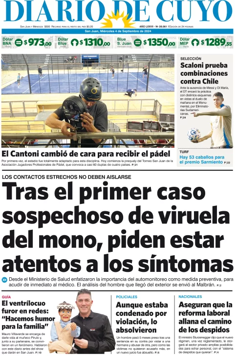 Diario de Cuyo | HOME | Edición impresa Tapa Edición 04 de Septiembre del 2024 Por Redacción Diario de Cuyo 04/09/2024 · 4:00 Escuchar la noticia Escuchar la noticia Your browser doesn’t support HTML5 audio Ver los comentarios ›