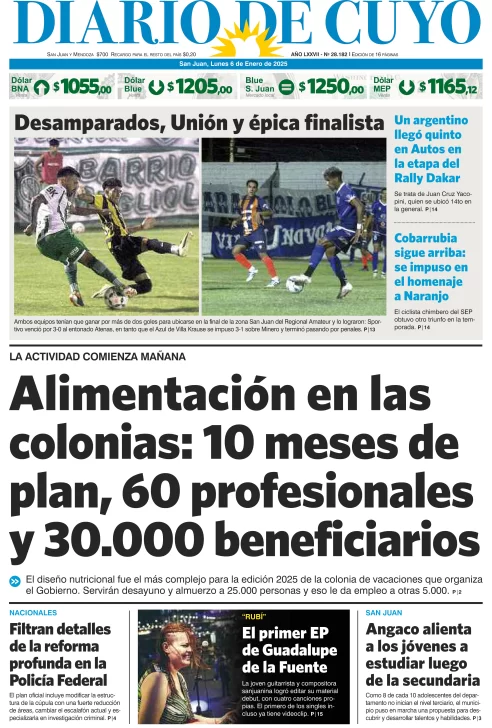 Diario de Cuyo | HOME | Edición impresa Tapa Edición 06 de Enero de 2025 Por Redacción Diario de Cuyo 06/01/2025 · 4:00 Escuchar la noticia Escuchar la noticia Your browser doesn’t support HTML5 audio Ver los comentarios ›