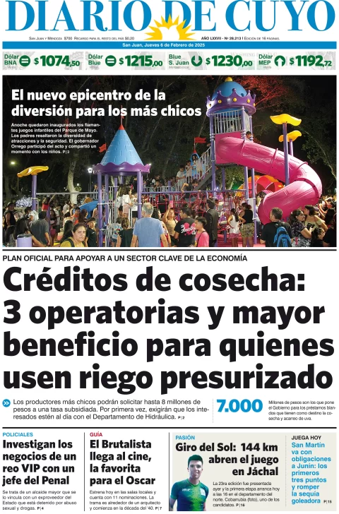 Diario de Cuyo | HOME | Edición impresa Tapa Edición 06 de Febrero del 2025 Por Redacción Diario de Cuyo 06/02/2025 · 4:00 Escuchar la noticia Escuchar la noticia Your browser doesn’t support HTML5 audio Ver los comentarios ›