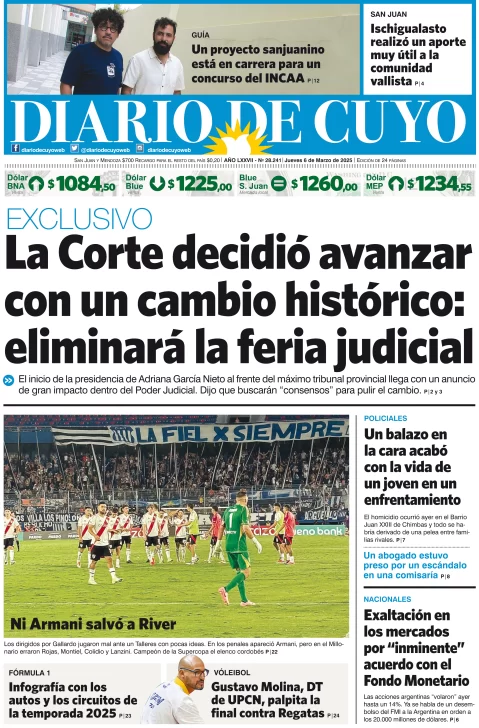 Diario de Cuyo | HOME | Edición impresa Tapa Edición 06 de Marzo de 2025 Por Redacción Diario de Cuyo 06/03/2025 · 4:00 Escuchar la noticia Escuchar la noticia Your browser doesn’t support HTML5 audio Ver los comentarios ›