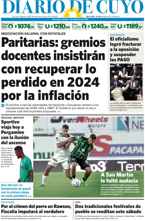 Diario de Cuyo | HOME | Edición impresa Tapa Edición 07 de Febrero del 2025 Por Redacción Diario de Cuyo 07/02/2025 · 4:00 Escuchar la noticia Escuchar la noticia Your browser doesn’t support HTML5 audio Ver los comentarios ›
