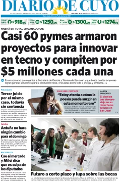 Diario de Cuyo | HOME | Edición impresa Tapa Edición 07 de Junio de 2024 Por Redacción Diario de Cuyo 07/06/2024 · 4:00 Escuchar la noticia Escuchar la noticia Your browser doesn’t support HTML5 audio Ver los comentarios ›