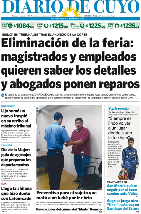 Diario de Cuyo | HOME | Edición impresa Tapa Edición 07 de Marzo de 2025 Por Redacción Diario de Cuyo 07/03/2025 · 4:00 Escuchar la noticia Escuchar la noticia Your browser doesn’t support HTML5 audio Ver los comentarios ›