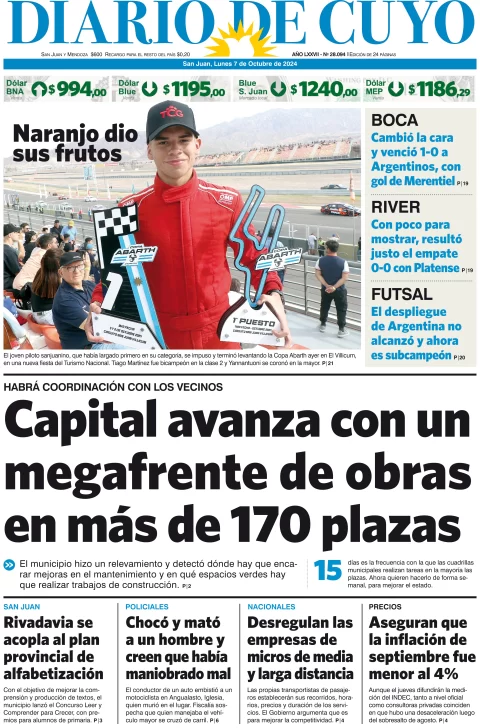Diario de Cuyo | HOME | Edición impresa Tapa Edición 07 de Octubre del 2024 Por Redacción Diario de Cuyo 07/10/2024 · 4:00 Escuchar la noticia Escuchar la noticia Your browser doesn’t support HTML5 audio Ver los comentarios ›