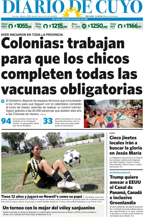 Diario de Cuyo | HOME | Edición impresa Tapa Edición 08 de Enero de 2025 Por Redacción Diario de Cuyo 08/01/2025 · 4:00 Escuchar la noticia Escuchar la noticia Your browser doesn’t support HTML5 audio Ver los comentarios ›
