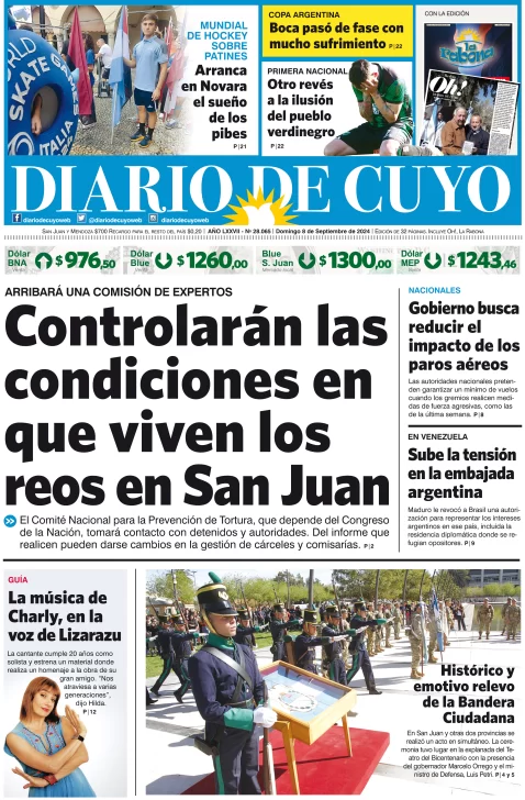 Diario de Cuyo | HOME | Edición impresa Tapa Edición 08 de Septiembre del 2024 Por Redacción Diario de Cuyo 08/09/2024 · 4:00 Escuchar la noticia Escuchar la noticia Your browser doesn’t support HTML5 audio Ver los comentarios ›