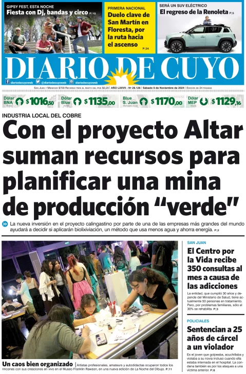 Diario de Cuyo | HOME | Edición impresa Tapa Edición 09 de Noviembre de 2024 Por Redacción Diario de Cuyo 09/11/2024 · 4:00 Escuchar la noticia Escuchar la noticia Your browser doesn’t support HTML5 audio Ver los comentarios ›