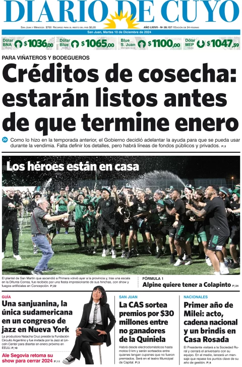 Diario de Cuyo | HOME | Edición impresa Tapa Edición 10 de Diciembre de 2024 Por Redacción Diario de Cuyo 10/12/2024 · 4:00 Escuchar la noticia Escuchar la noticia Your browser doesn’t support HTML5 audio Ver los comentarios ›
