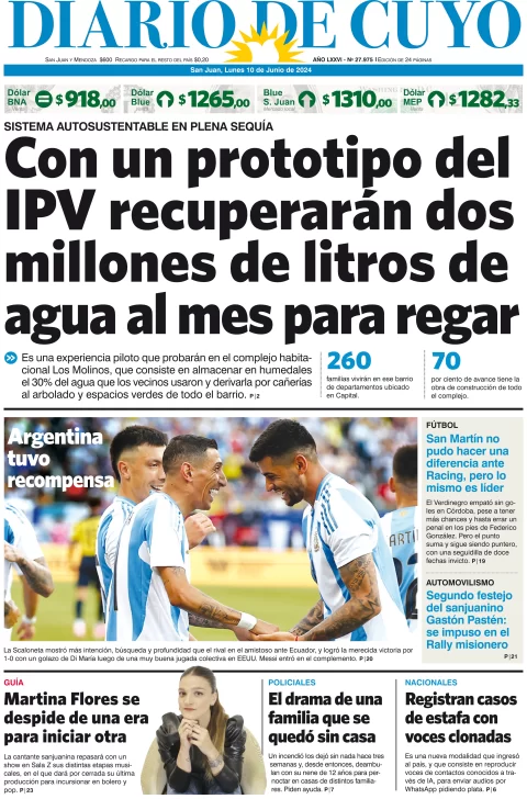 Diario de Cuyo | HOME | Edición impresa Tapa Edición 10 de Junio del 2024 Por Redacción Diario de Cuyo 10/06/2024 · 4:00 Escuchar la noticia Escuchar la noticia Your browser doesn’t support HTML5 audio Ver los comentarios ›