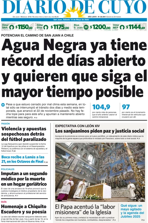 Diario de Cuyo | HOME | Edición impresa Tapa Edición 10 de Mayo de 2025 Por Redacción Diario de Cuyo 10/05/2025 · 4:00 Escuchar la noticia Escuchar la noticia Your browser doesn’t support HTML5 audio Ver los comentarios ›