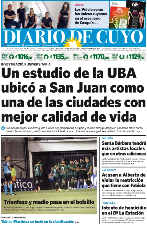 Diario de Cuyo | HOME | Edición impresa Tapa Edición 10 de Noviembre de 2024 Por Redacción Diario de Cuyo 10/11/2024 · 4:00 Escuchar la noticia Escuchar la noticia Your browser doesn’t support HTML5 audio Ver los comentarios ›