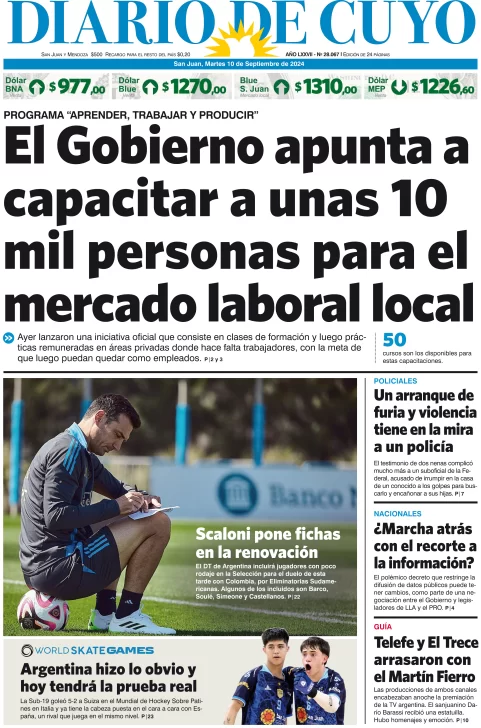Diario de Cuyo | HOME | Edición impresa Tapa Edición 10 de Septiembre del 2024 Por Redacción Diario de Cuyo 10/09/2024 · 4:00 Escuchar la noticia Escuchar la noticia Your browser doesn’t support HTML5 audio Ver los comentarios ›