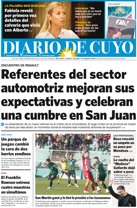 Diario de Cuyo | HOME | Edición impresa Tapa Edición 11 de Agosto de 2024 Por Redacción Diario de Cuyo 11/08/2024 · 4:00 Escuchar la noticia Escuchar la noticia Your browser doesn’t support HTML5 audio Ver los comentarios ›