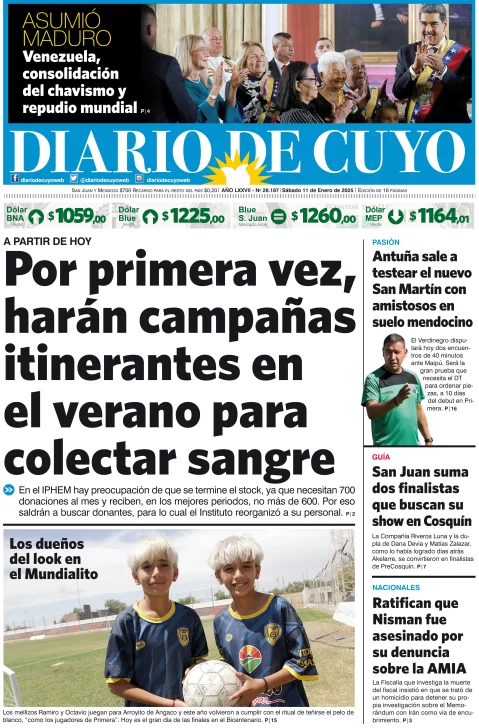 Diario de Cuyo | HOME | Edición impresa Tapa Edición 11 de Enero de 2025 Por Redacción Diario de Cuyo 11/01/2025 · 4:00 Escuchar la noticia Escuchar la noticia Your browser doesn’t support HTML5 audio Ver los comentarios ›