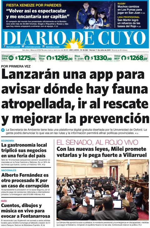 Diario de Cuyo | HOME | Edición impresa Tapa Edición 11 de Julio de 2025 Por Redacción Diario de Cuyo 11/07/2025 · 4:00 Escuchar la noticia Escuchar la noticia Your browser doesn’t support HTML5 audio Ver los comentarios ›