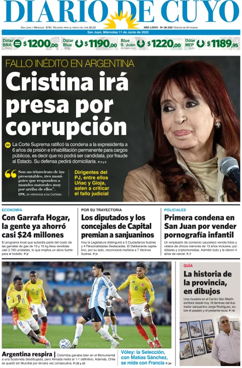 Diario de Cuyo | HOME | Edición impresa Tapa Edición 11 de Junio de 2025 Por Redacción Diario de Cuyo 11/06/2025 · 4:00 Escuchar la noticia Escuchar la noticia Your browser doesn’t support HTML5 audio Ver los comentarios ›