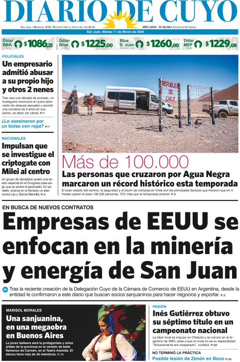 Diario de Cuyo | HOME | Edición impresa Tapa Edición 11 de Marzo de 2025 Por Redacción Diario de Cuyo 11/03/2025 · 4:00 Escuchar la noticia Escuchar la noticia Your browser doesn’t support HTML5 audio Ver los comentarios ›