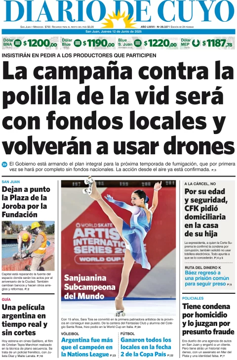 Diario de Cuyo | HOME | Edición impresa Tapa Edición 12 de Junio de 2025 Por Redacción Diario de Cuyo 12/06/2025 · 4:00 Escuchar la noticia Escuchar la noticia Your browser doesn’t support HTML5 audio Ver los comentarios ›