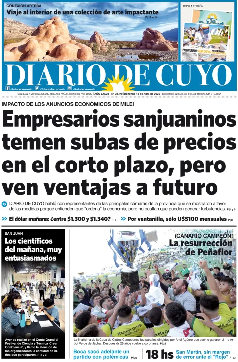 Diario de Cuyo | HOME | Edición impresa Tapa Edición 13 de Abril de 2025 Por Redacción Diario de Cuyo 13/04/2025 · 4:00 Escuchar la noticia Escuchar la noticia Your browser doesn’t support HTML5 audio Ver los comentarios ›