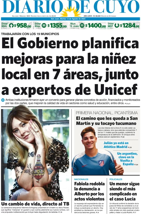 Diario de Cuyo | HOME | Edición impresa Tapa Edición 13 de Agosto del 2024 Por Redacción Diario de Cuyo 13/08/2024 · 4:00 Escuchar la noticia Escuchar la noticia Your browser doesn’t support HTML5 audio Ver los comentarios ›