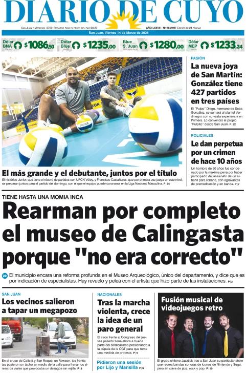 Diario de Cuyo | HOME | Edición impresa Tapa Edición 14 de Marzo de 2025 Por Redacción Diario de Cuyo 14/03/2025 · 4:00 Escuchar la noticia Escuchar la noticia Your browser doesn’t support HTML5 audio Ver los comentarios ›