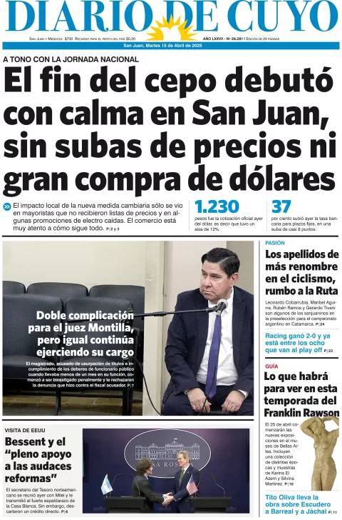 Diario de Cuyo | HOME | Edición impresa Tapa Edición 15 de Abril de 2025 Por Redacción Diario de Cuyo 15/04/2025 · 4:00 Escuchar la noticia Escuchar la noticia Your browser doesn’t support HTML5 audio Ver los comentarios ›