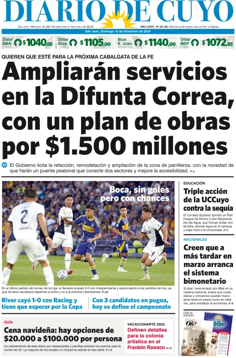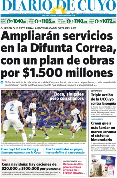 Diario de Cuyo | HOME | Edición impresa Tapa Edición 15 de Diciembre de 2024 Por Redacción Diario de Cuyo 15/12/2024 · 3:40 Escuchar la noticia Escuchar la noticia Your browser doesn’t support HTML5 audio Ver los comentarios ›
