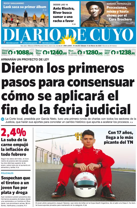 Diario de Cuyo | HOME | Edición impresa Tapa Edición 15 de Marzo de 2025 Por Redacción Diario de Cuyo 15/03/2025 · 4:00 Escuchar la noticia Escuchar la noticia Your browser doesn’t support HTML5 audio Ver los comentarios ›
