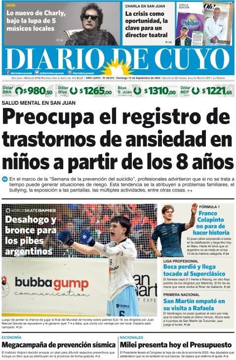 Diario de Cuyo | HOME | Edición impresa Tapa Edición 15 de Septiembre del 2024 Por Redacción Diario de Cuyo 15/09/2024 · 4:00 Escuchar la noticia Escuchar la noticia Your browser doesn’t support HTML5 audio Ver los comentarios ›